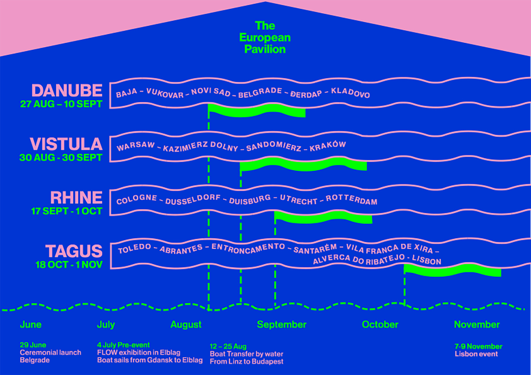 Liquid Becomings is not a traditional pavilion or building, nor is it a space to be filled. It's a time-based liquid pavilion, a river of journeys, made up of small boats that travelled along four of Europe's great rivers - the Danube, the Rhine, the Tagus and the Vistula - through thirteen different countries.
