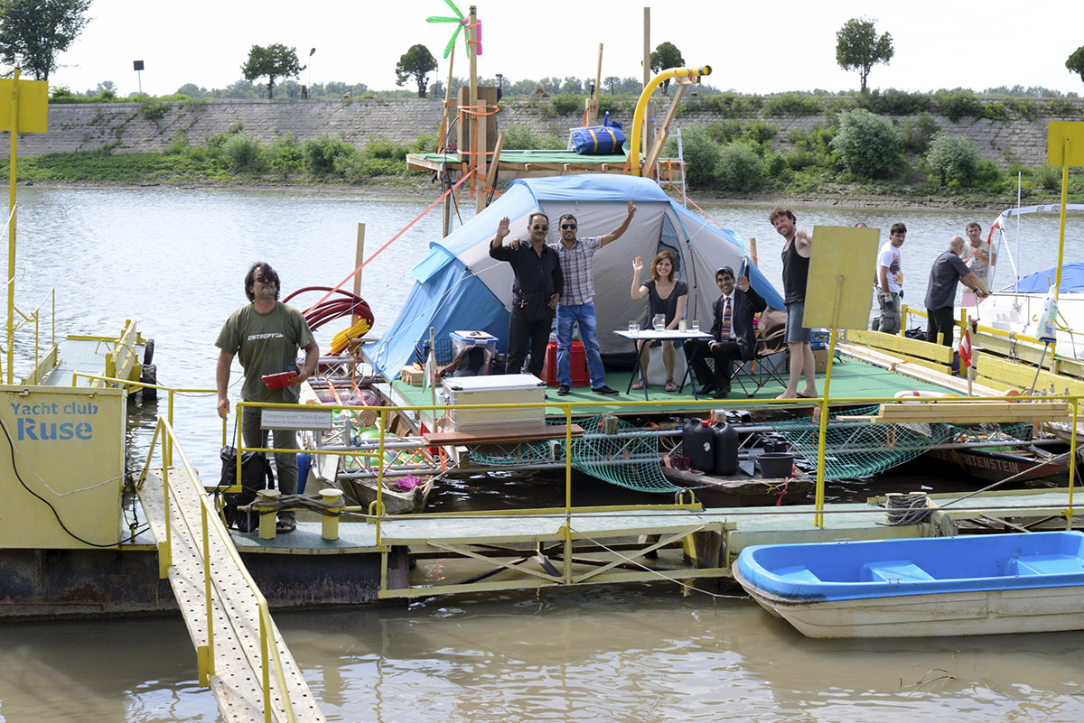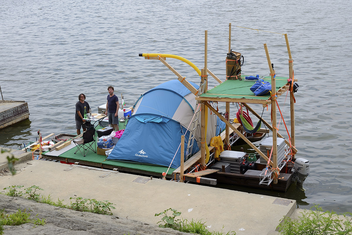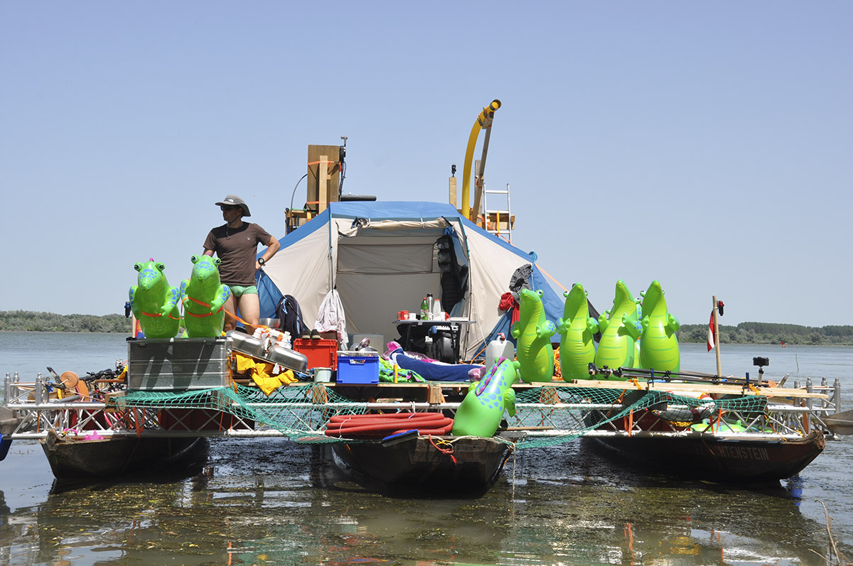 The trimaran, a traditional barge common along the Austrian Danube, served as the basis of its construction. The MS CARGO’s unique design was developed to enable landing and anchoring at remote stretches of the river bank independent of mooring points. In the summer of 2014, Rainer Prohaska joined by Volker Schmidt explored the Danube from Melk to its estuary in the Black Sea for nine weeks. The focus of the expedition was to survey the Danube culture and to scout out the river as an experimental space for art. Thanks to its lightweight design, the MS CARGO allowed Prohaska and Schmidt to engage the local population independent of the official water transport infrastructure. In doing so, the MS CARGO assumed a dual function as a sailing sculpture and a mobile medium of communication. In addition to theater director and author Volker Schmidt, Rainer Prohaska invited artists, theorists and scientists to join him in his artistic exploration of the Danube from Melk to Sulina.