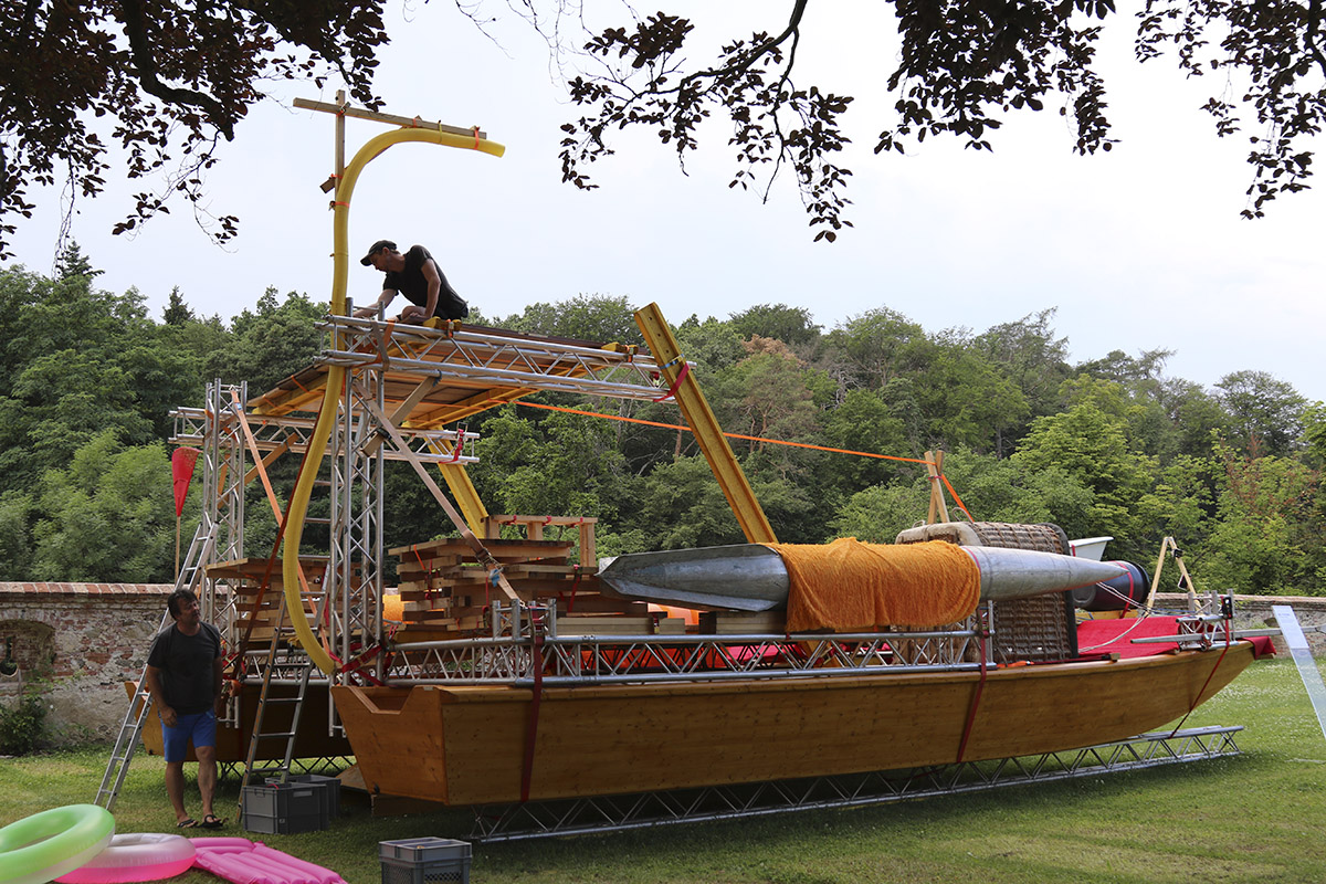 In June 2019, the ship MS-FUSION was built at Schallaburg Castle. Referring to the exhibition theme, not only the finished ship was on display, but also the construction phase could be observed by the public. This trimaran, optimized for travel on the Danube, was built using the "Toy-Kit" method developed by Prohaska, which primarily uses connecting elements such as tension belts and screw clamps.