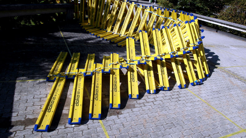 The work title translates to A Swarm Of and mirrors the construction process as well as the formal aspect of the piece. Consisting of a multitude of H girders fixed with tensioners, the construction forms a spiral structure that curled over various buildings and planes. The piece was developed by swarm within the framework of a collective planning and building process with all its social structures.